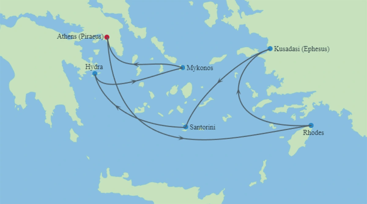 Athens (Piraeus) - Rhodes - Ephesus (Kusadasi), Turkey - Santorini - Hydra - Myconos - Athens