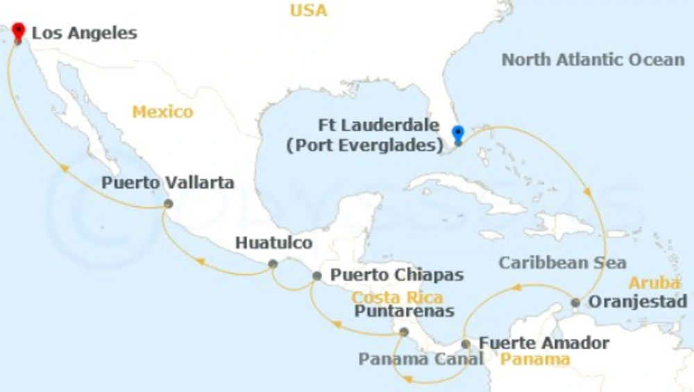Ft. Lauderdale, Florida - Aruba - Panama Canal Full Transit Historical Locks - Fuerte Amador, Panama (for Panama City) - Puntarenas, Costa Rica - Puerto Chiapas, Mexico - Huatulco, Mexico - Puerto Vallarta, Mexico - Los Angeles, CA